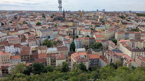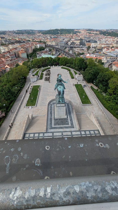 After we’d rested and got cleaned up, Jack and I took our guests back up the hill to the National Memorial, which boasts an outstanding, 360-degree view of the entire city from its roof. A few hundred Czech Army soldiers were up there this morning as well, rehearsing for a commemoration ceremony which will be held there on Thursday, the 80th anniversary of V.E. Day.