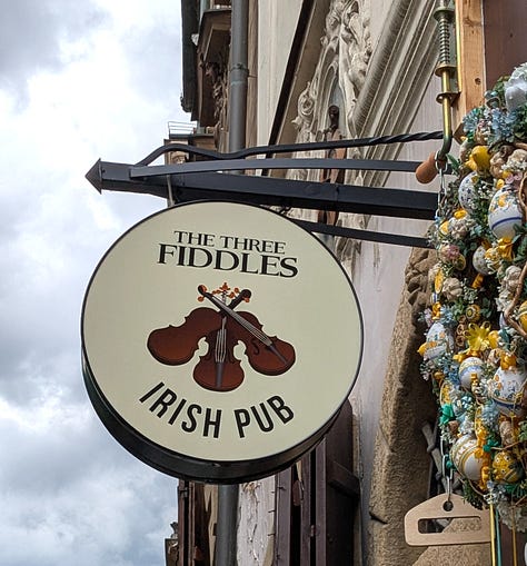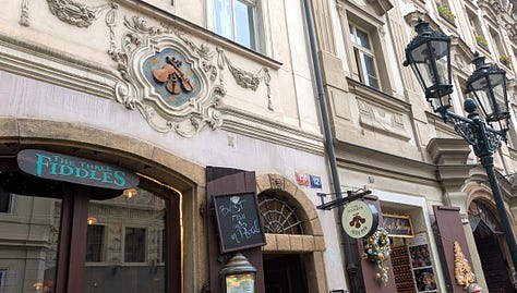 We wandered around there a little bit, then into Malá Strana (Lesser Quarter), the castle district, and the 15th-century streets of Nový Svět. We ended the afternoon’s tour at The Three Fiddles Irish pub, where the bartender spoke English and they served Kilkenny and a great fish fry.