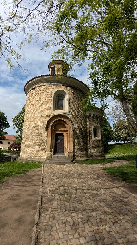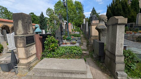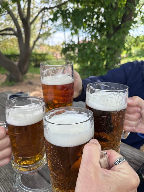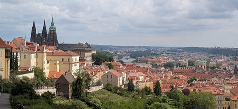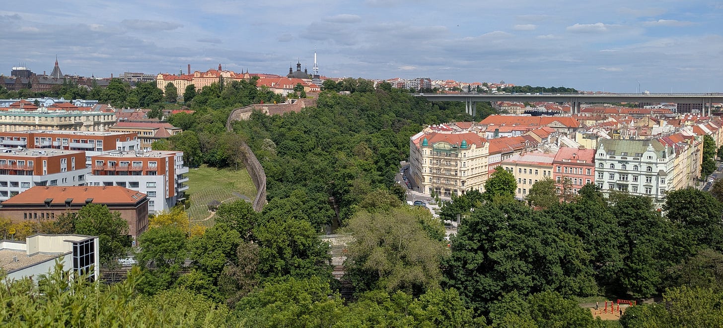 Our last stop in the show-Carol-and-Dag-around-Prague tour was a trip to Vyšehrad, an old fortress which is now a public park. It’s got history, a beautiful old cemetery (with the likes of Czech composer Antonín Dvořák among the residents), great views of the city, and — bonus — a beer garden. (P.S. the beers you see in the photo below cost us $2.50 each.)
