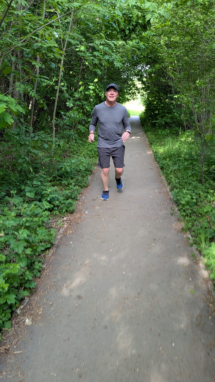 Dag and I headed out first thing this morning for my scheduled 5-mile run. It stretched to more like 6.5 miles as I took him down the entire length of the (occasionally challenging) paths extending east from our park, before we turned back to retrace our route.